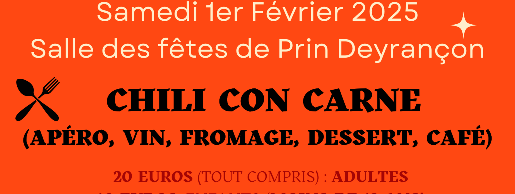 Ambiance mexicaine garantie pour la soirée karaoké à la salle des fêtes de Prin-Deyrançon ! Un repas thématique vous attend avec apéritif, chili con carne, vin, fromage, dessert et café. N'oubliez pas vos assiettes et couverts. Votre réservation sera confirmée après réception du paiement.